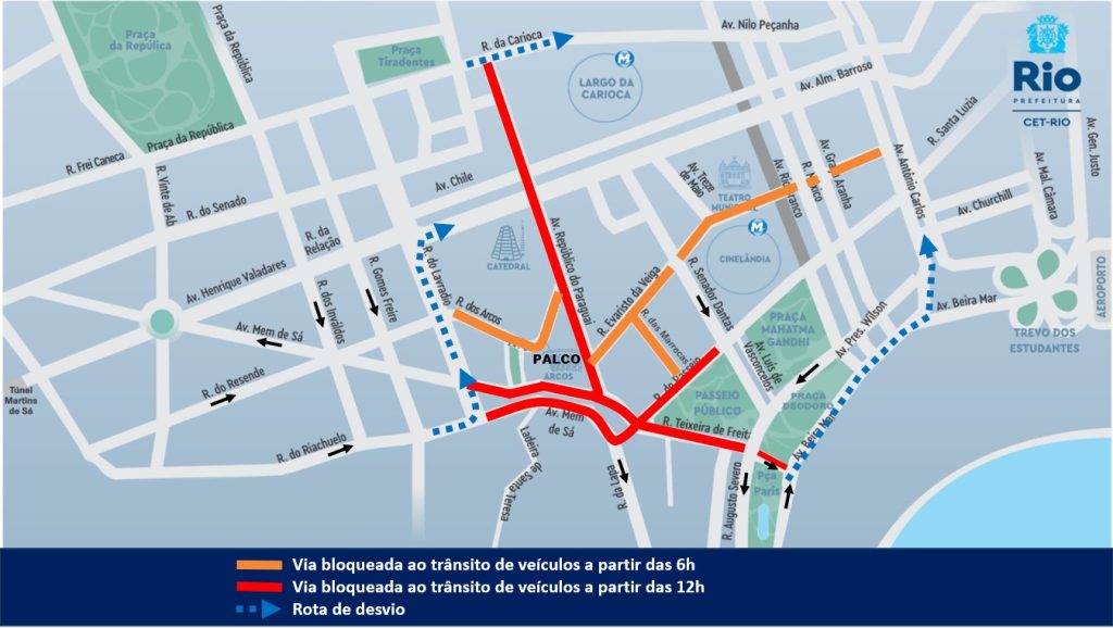 – Os veículos que utilizariam a Avenida República do Paraguai, vindos da Avenida Passos, deverão seguir pela Rua da Carioca até a Avenida Graça Aranha, a partir da qual poderão acessar seus destinos.